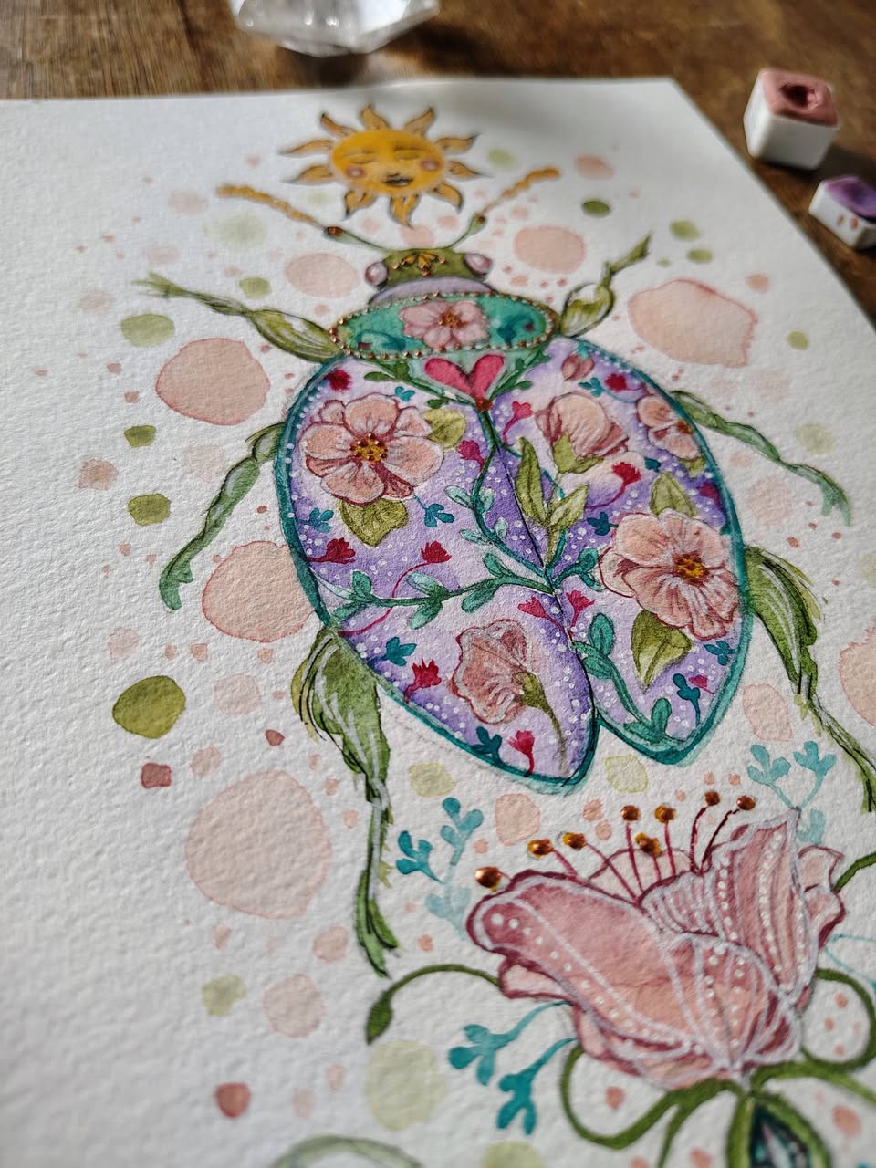 Il incarne la force intérieure, l'intuition et la capacité à surmonter les obstacles grâce à une évolution profonde et alchimique. Le scarabée invite à faire confiance à son potentiel, à prendre soin de soi et à rester ancré dans la réalité tout en étant ouvert aux changements.