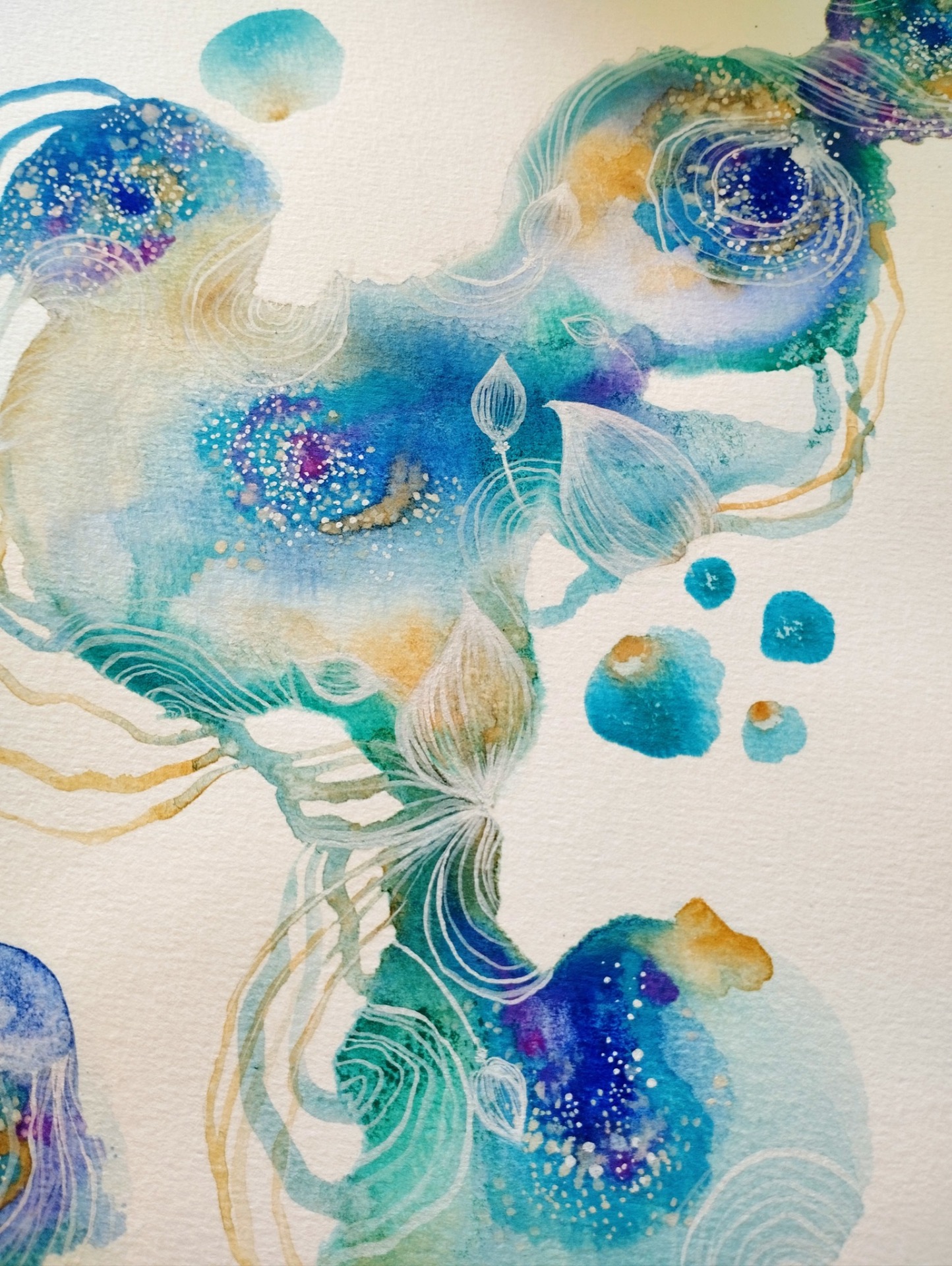Cette peinture est en lien avec notre chakra de la gorge & notre troisième oeil qui sont en relation avec notre authenticité, la connaissance de soi, la libre expression sans crainte de dire sa vérité et la manifestation de l'essence de notre âme